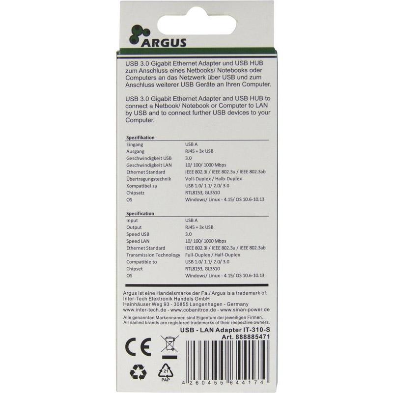 INTER-TECH Argus IT-310-S adapter vam omogoča povezavo med vašim omrežjem in prostim USB 3.0 priključkom vašega prenosnika ali računalnika. Poleg tega nudi tudi USB 3.0 razdelilnik (3x). Ohišje adapterja je izdelano iz aluminija.