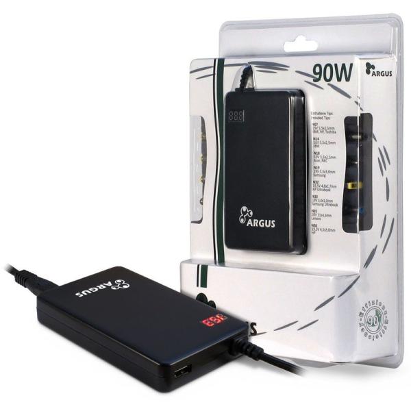 Univerzalni napajalnik za prenosnike Inter-Tech Argus NB-90SA lahko napaja večino najbolj razširjenih prenosnikov na trgu. Priloženih je 8 različnih nastavkov. S tankim dizajnom ga lahko pospravite skoraj v vsako torbo za prenosnike. Omogoča samodejno spreminjanje napetosti glede na izbran nastavek. Dodatno je Argus NB-90SA opremljen z USB priključkom (5V/2,1A) za polnjenje USB naprav, kot so pametni telefoni in tablice. Ponuja več kot 91% učinkovitosti in tako ščiti tako denarnico kot okolje.