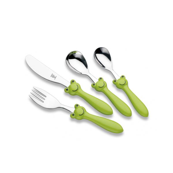 4-delni OTROŠKI JEDILNI PRIBOR ŽABA JUSTINUS bo poskrbel za veliko zabavo pri poskušanju različne hrane za najmlajše. Smešni motivi žabic bodo obroke naredili zanimivejše in spodbudili otroke k njihovi samostojni uporabi. Pribor je izdelan iz nerjavečega jekla 18/0 in vključuje otroško žlico, otroško vilico, otroško žličko in otroški nož.
