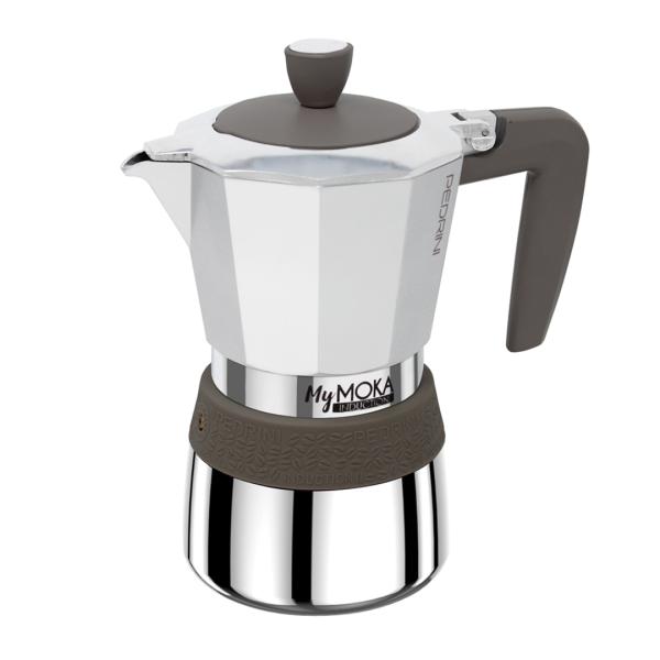 PEDRINI KAFETIERA MY MOKA je izdelana iz aluminija in okrašena z edinstvenimi detajli, kot je siv silikonski ročaj za varen oprijem. Primerna je za uporabo na vseh kuhalnih površinah tudi na indukciji. Kafetiere ne postavljajte v pomivalni stroj.