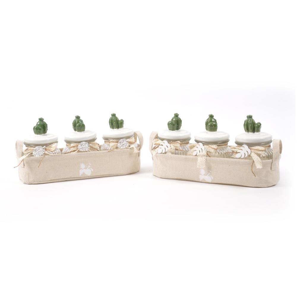 Set steklenih doz za shranjevanje s porcelanastim pokrovom in simpatičnim dodatkom kaktusa v priročni košarici.
