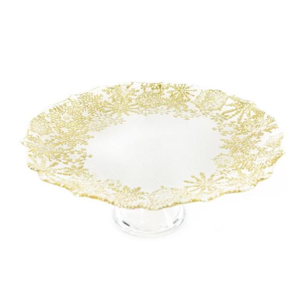 Steklen servirni podstavek za slane in sladke prigrizke s premerom 32 cm vas bo zagotovo navdušil s pozlačenim motivom, ki spominja na snežinko in pričaral praznično vzdušje na vaši mizi ali kuhinjskem pultu.