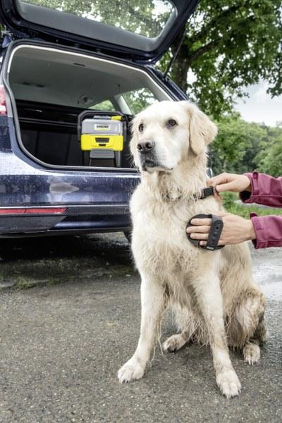 Mobilni Kärcherjev tlačni čistilnik z litij-ionsko akumulatorsko baterijo in snemljivim rezervoarjem za vodo je odlična naprava za hitro in preprosto čiščenje hišnih ljubljenčkov, npr. ko se s svojim psom po sprehodu vrnete k avtomobilu. Zaradi nizkega tlaka je vodni curek posebno nežen in neoporečen za uporabo na živalih, zato umazanijo z lahkoto izpere z dlake. Vključuje škatlo Pet Box z optimalno prilagojenim priborom: šoba s stožčastim curkom s prijetnim, mehkim curkom za čiščenje občutljivih živali, krtača za odstranjevanje trdovratne umazanije z živalske dlake in posebna brisača iz mikrovlaken (vpija veliko vode in ne pušča vonjav) za sušenje živali. Škatla s priborom omogoča zelo preprosto spravljanje s pritrditvijo na napravi.