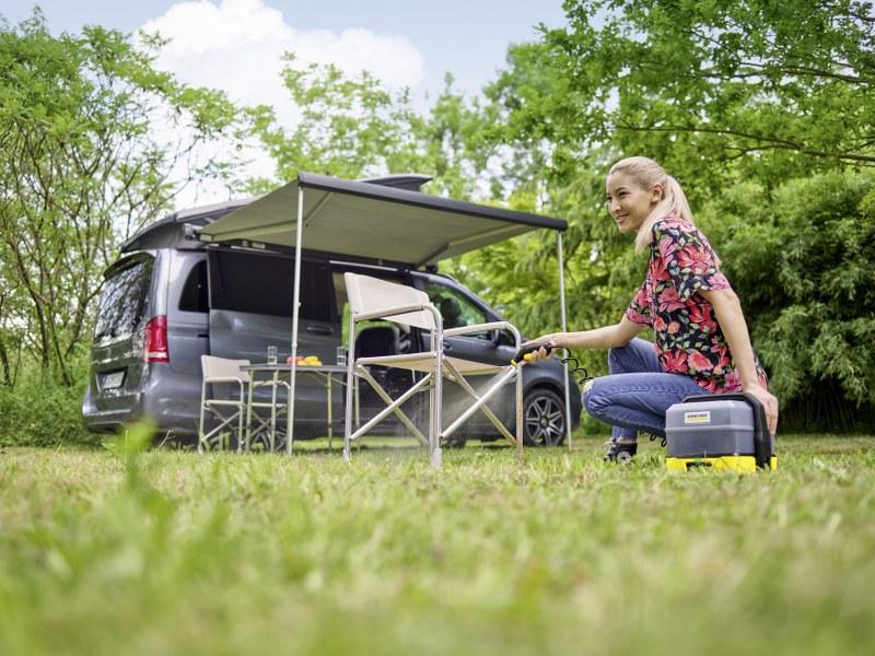 Za vse, ki iščejo učinkovito rešitev za čiščenje na poti: kompakten in lahek tlačni čistilnik Kärcher. Zahvaljujoč vgrajeni litij-ionski bateriji in snemljivemu rezervoarju za vodo, lahko na primer očistite kolo ali umazane pohodniške čevlje tudi brez priključka za elektriko ali vodo. Z nežnim, a učinkovitim nizkotlačnim ploščatim curkom, je visokotlačni čistilnik idealen za občutljive površine. LED-zaslon signalizira tudi, ko je baterija skoraj prazna ali se polni. Na voljo so različne škatle z dodatki za široko paleto možnosti uporabe in razširitve.
