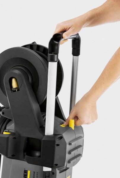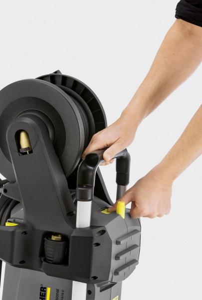 Praktičen, mobilen, vsestranski: visokotlačni čistilnik s hladno vodo HD 5/17 CX Plus za delo v vodoravnem in navpičnem položaju. S predalom za dodatke, medeninasto cilindrično glavo in avtomatsko razbremenitvijo tlaka.