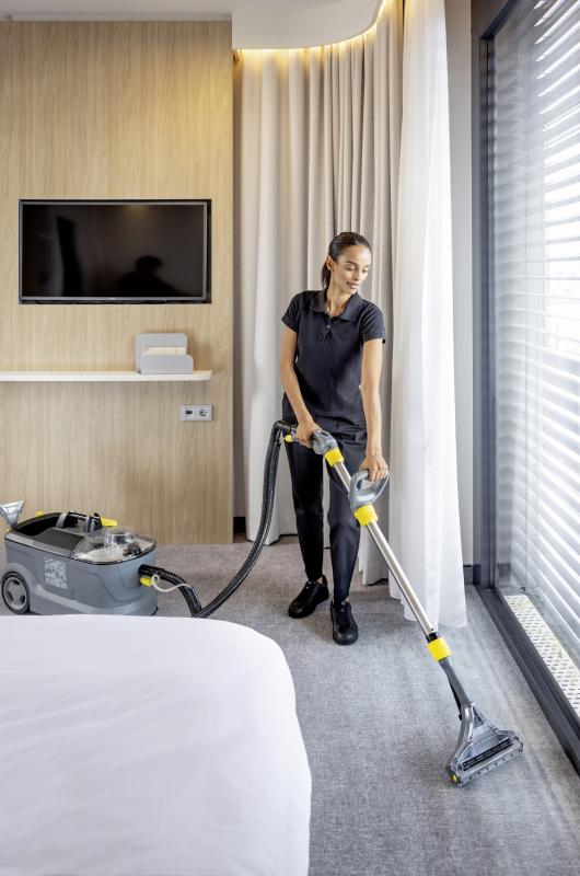 Puzzi 10/1 s šobo za oblazinjene površine in talno šobo je še posebej primeren za higienično in učinkovito čiščenje manjših do srednjih površin. Z 1 bar razpršilnega tlaka ta razpršilno-ekstrakcijska naprava skrbi za nežno globinsko čiščenje tekstilnih površin in vam še posebej pri čiščenju oblazinjenih površin in preprog zagotavlja prepričljive rezultate. Zahvaljujoč ozki šobi je naprava optimalno primerna za uporabo na ozkih predelih. S pomočjo prilagodljive sesalne gume lahko sedaj brez težav očistite tudi zelo izpostavljene površine. Razpršilno-ekstrakcijska naprava je opremljena s kavljem za kabel ter pritrditvijo za ročno šobo in sesalno cev.