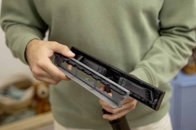Priročna polička na napravi za shranjevanje gobic, krp in drugih manjših predmetov med čiščenjem na dosegu roke.