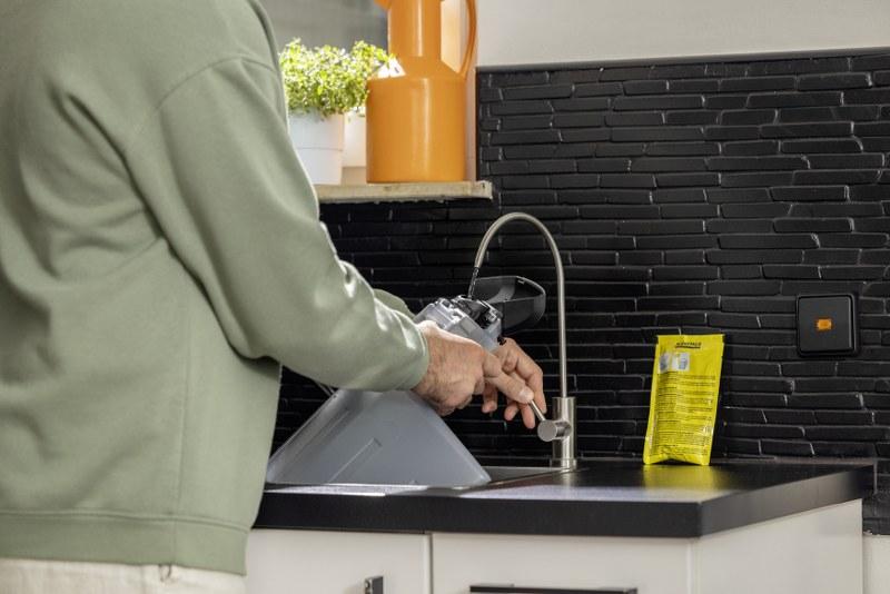 Rezervoar za svežo vodo je enostavno napolniti in izprazniti, ne da bi bilo treba odpirati čistilnik za pršenje. Odporna na udarce in prosojna posoda za dolgo življenjsko dobo. Rezervoar za svežo vodo se enostavno vstavi v napravo.