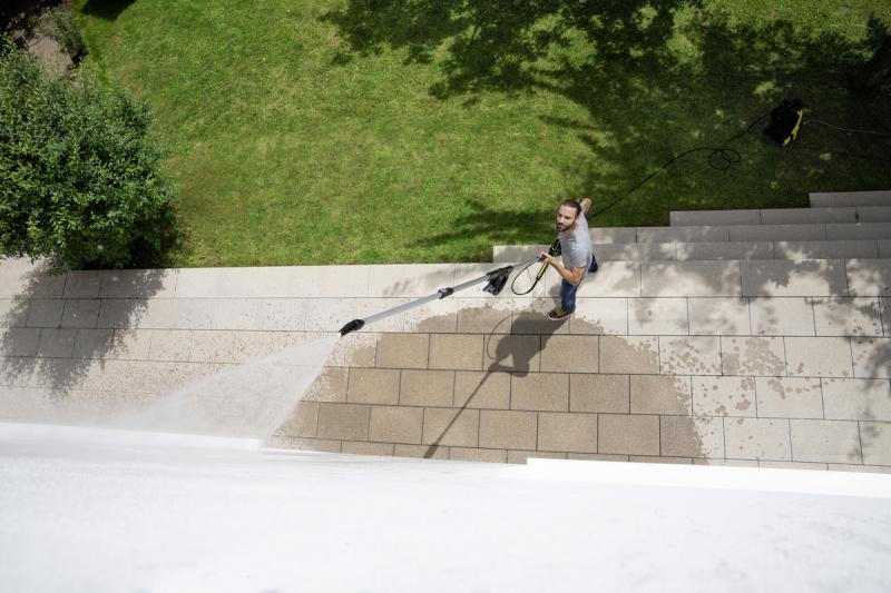 S teleskopsko cevjo lahko hitro in brez napora očistite tudi težko dostopna mesta, na primer pod fasado. Za 180° nastavljiv zglob je še ena dodatna prednost, ki omogoča čiščenje zimskih vrtov, poševnih streh in nadstreškov za avtomobile. Uporaba je zelo preprosta zahvaljujoč udobnemu teleskopskemu mehanizmu, ki se sproži s pritiskom na gumb. Teleskopska cev se lahko raztegne od 1,2 do 3,7 metra, da je mogoče očistiti površine na višini do 5 metrov. Pritrditev na vse vrste razpršilnih pištol je zelo preprosta. Pri uporabi z razpršilno pištolo Full Control Plus ali Smart Control lahko udobno uravnavate tlak čiščenja.