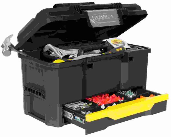 Stanley 48cm kaseta za orodje s predalom - 19" kaseta z zapahi, ki omogočajo enoročno odpiranje kasete - Robustna vodila z vgrajenimi krogličnimi ležaji za predale - Vsestransko shranjevanje orodja vseh velikosti in tudi za majhne dele in pripomočke - Robustno oblikovana za dodatno moč in trpežnost - Širok mehak ročaj na vrhu za lažji transport, 2/3 odstranljiv pladenj omogoča dovolj prostora za shranjevanje večjega orodja na spodnji strani - V zareza na zgornji strani pokrova omogoča stransko žaganje. integrirane žabice za zaklepanje in varno shranjevanje vsebine