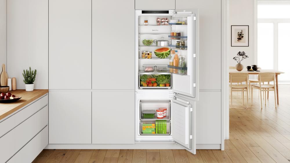 Prostoren vgradni hladilnik z zamrzovalnikom spodaj v kombinaciji z VitaFresh XXL predalom, ki ohrani živila dlje časa sveža.