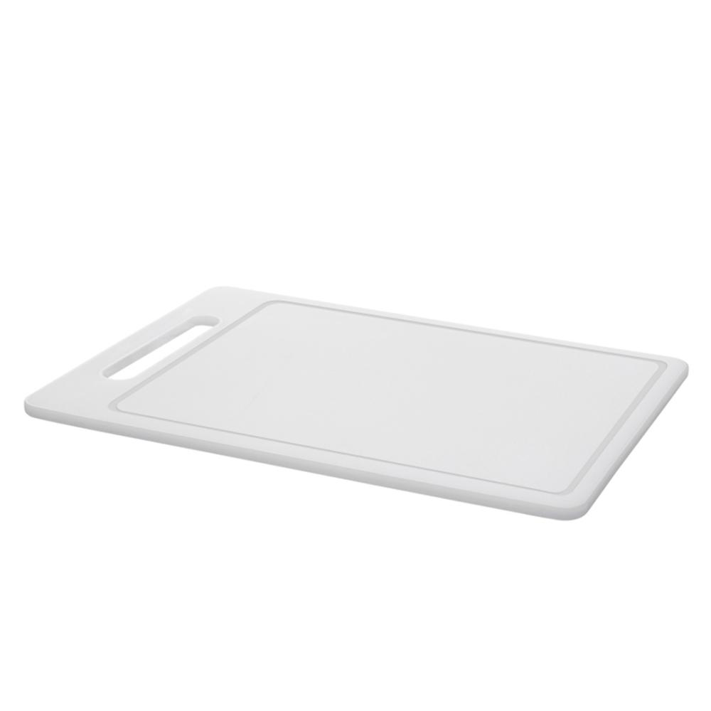 EVA PLASTIČNA DESKA ZA REZANJE 40 x 30 cm je izdelana iz polietilena, ki je plastičen material z dobro kemično odpornostjo na večino živilskih kislin, detergentov in vročo vodo. Pri robovih ima kanal za zbiranje tekočine. Deska ne pušča vonja in okusa in je primerna za pomivanje v pomivalnem stroju.
