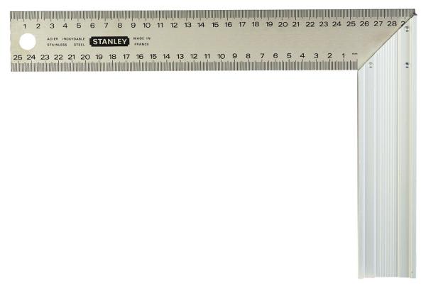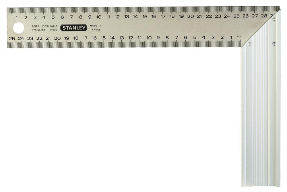 Tesarski kotnik - aluminijevo pravokotno držalo - aluminijevo držalo je tritočkovno pritrjeno na trak, za moč in čvrstost in natančnost - dobro vidna, globoko vtisnjena jedkana lestvica na nerjavečem kovinskem traku - držalo odrezano postrani za kote 45 in 90 - lestvica v mm na obeh straneh - 140 x 250 mm