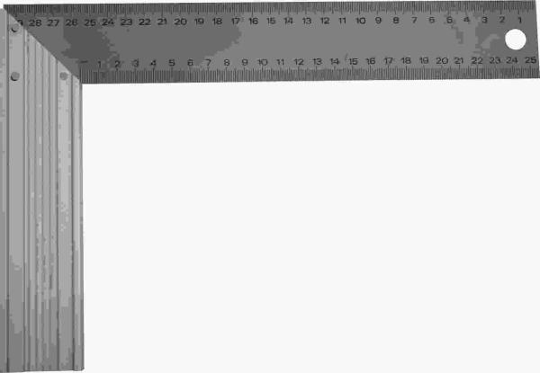 Tesarski kotnik - aluminijevo pravokotno držalo - aluminijevo držalo je tritočkovno pritrjeno na trak, za moč in čvrstost in natančnost - dobro vidna, globoko vtisnjena jedkana lestvica na nerjavečem kovinskem traku - držalo odrezano postrani za kote 45 in 900 - lestvica v mm na obeh straneh - 200 x 400 mm