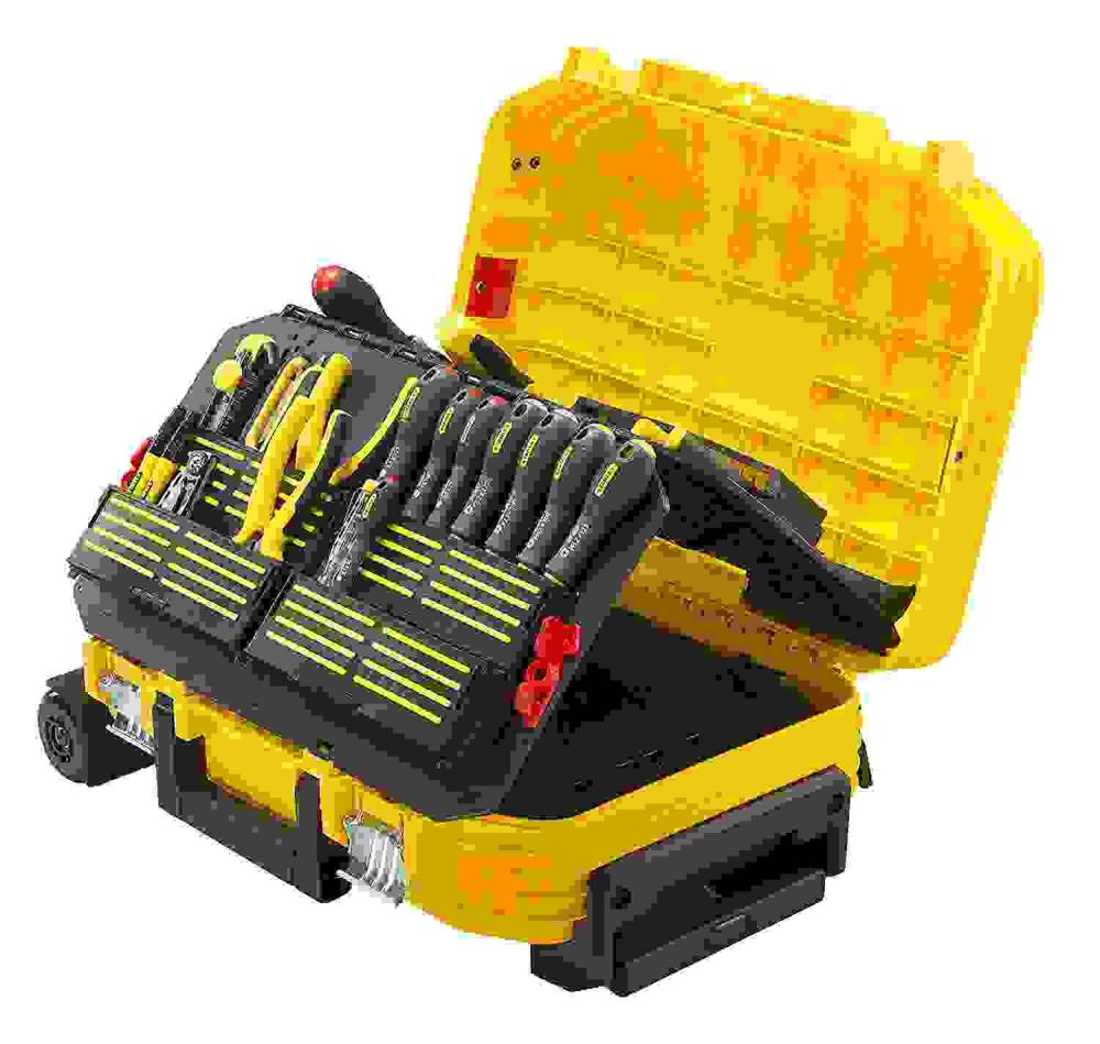 Stanley Fatmax kovček s priloženim orodjem - Robusten zaščitni kovček s kovinskimi zapahi - ojačan s steklenimi vlakni - Odstranljive in zložljive predelne stene za fleksibilnost in dosegjivost orodja med delom - Gumiran ročaj za izboljšan oprijem in udobje - Zaščita posode s steklenimi vlakni s kovinskimi zaponkami - Odstranljve "posodice" za lažjo organizacijo - Harmoničasta zasnova za boljšo dostopnost in pregled nad orodjem - Podporne noge na hrbtni strani pokrova za dodatno stabilnost med odpiranjem - Kartica z imenom in zaklepanjem z obešanko - Vključen obsežen komplet orodja