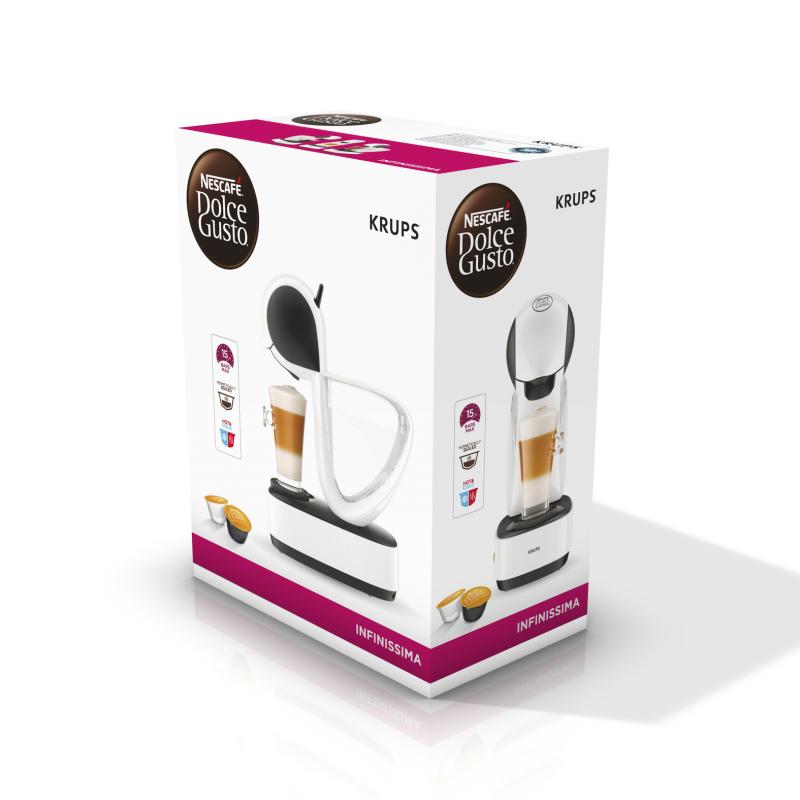 Kavni aparat Krups Dolce Gusto KP170110 Infinissima v elegantni obliki je navdihnil simbol neskončnosti. Upravljanje je ročno, samo vstavite vašo najljubšo Nescafé Dolce Gusto kapsulo in izberite toplo ali hladno vodo in napitek je pripravljen.