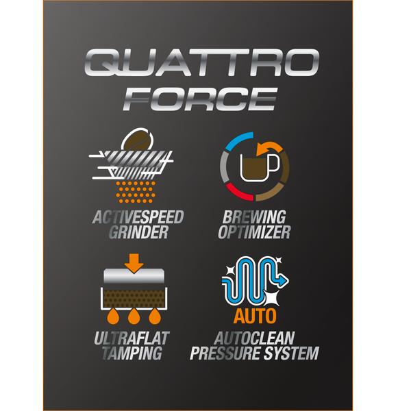 Sistem KRUPS Quattro Force optimizira vsak korak priprave espressa in zagotavlja 20 % hitrejše mletje, izrednoravno potlačenje, izvrstno filtriranje in napredno odcejanje za dolgotrajno učinkovitost. Privoščite si popolne kavne pijače kar doma, povsem preprosto in brez čakanja, z aparatom dovršenega in elegantnega videza. Aparat Krups Evidence se ponaša tudi z avtomatskih dvojnim ciklom mletja kave in po višini nastavljivim iztekom kave, ki ustreza različnim velikostim skodelic.
