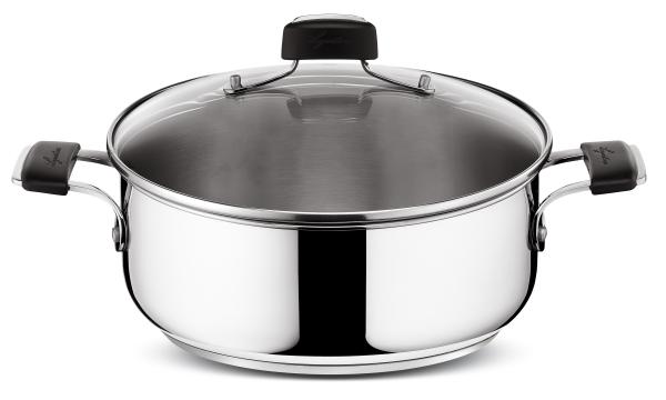 Nizka kozica Lagostina TEMPRA z dvema ročajema iz nerjavečega jekla 18/10 je opremljena s praktičnimi jeklenimi ročaji, privarjenimi na posodo. Ročaji in držalo pokrova so dodatno prevlečeni z nedrsečim silikonom za bolj varen oprijem. Zaradi modernega izgleda jo lahko postavite tudi pred goste.