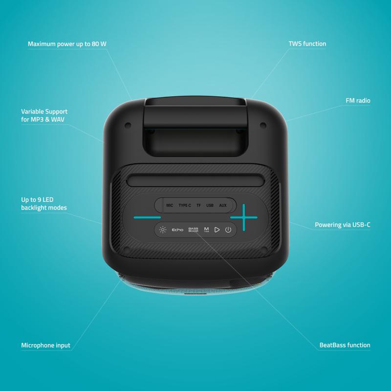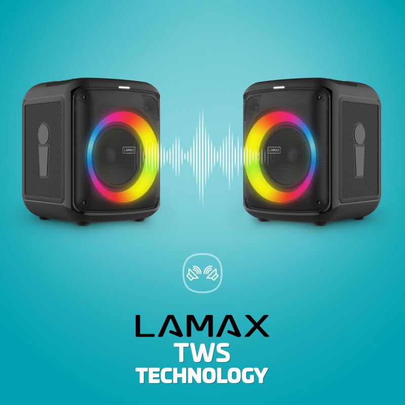 Ne glede na to, ali načrtujete zabavo, si želite ogledati film, iti na vadbo ali samo poslušati podcast, LAMAX PartyKing1 Play vas bo popolnoma razorožil s svojim 80 W zvokom. Če to ni bilo dovolj za zabavo, lahko priključite še en zvočnik zahvaljujoč funkciji TWS (True Wireless Stereo) in podvojite zmogljivost. Brez zakasnitve, samo čist in uravnotežen zvok, ki ga podpira tehnologija BeatBass®, ki doda koncertno dimenzijo in vas potegne neposredno v vsako skladbo. Pravo vzdušje dopolnjuje 9 nastavljivih LED učinkov.