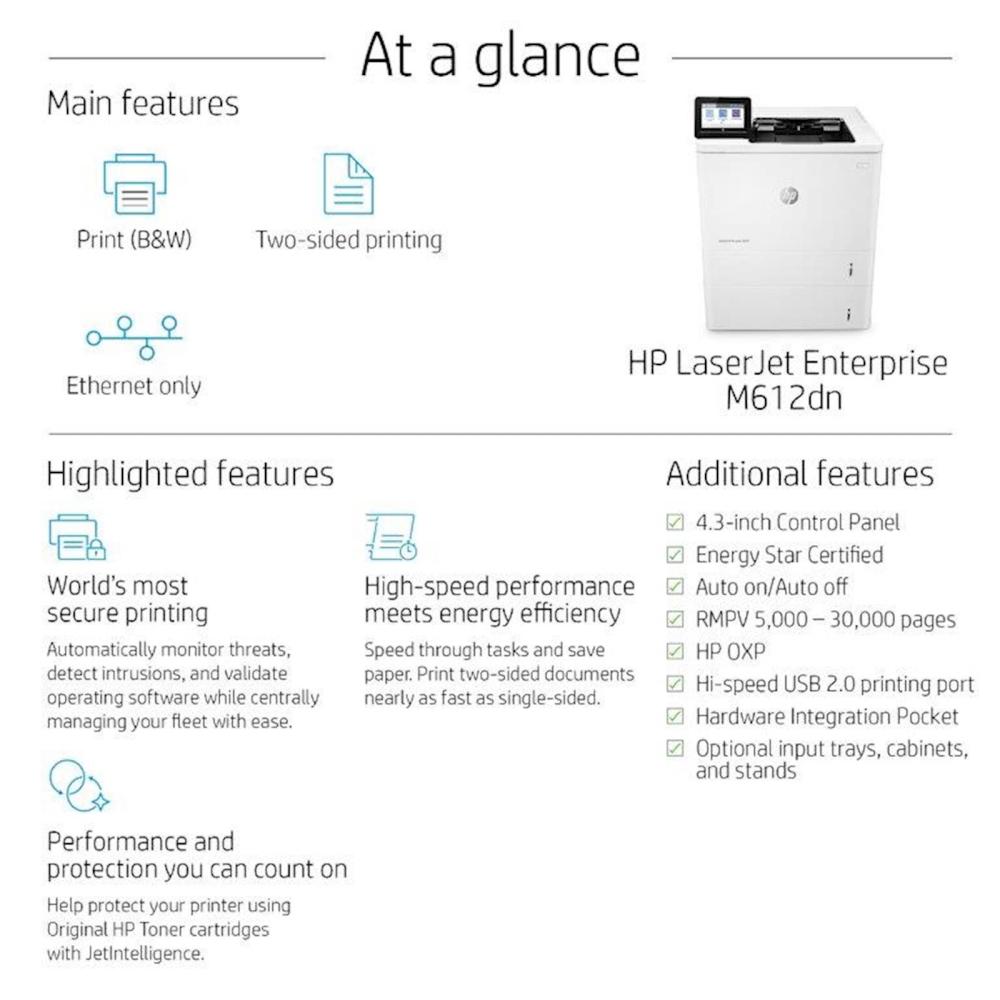 HP LaserJet Enterprise M612dn, združuje izjemno zmogljivost, varnost in energetsko učinkovitost. Odlikuje ga visoka kvaliteta izpisa ter hitrost tiskanja 71 strani A4 na minuto. Tiskalnik lahko nadgradite z dodatno kaseto za papir, 550-listno ali 2.100 listno.