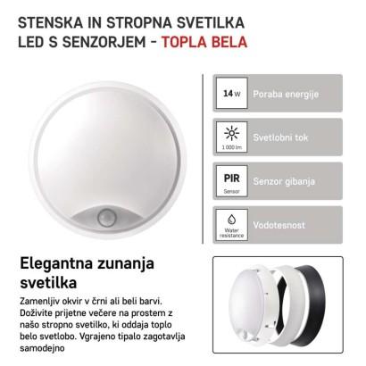 LED svetilo nadometno ZURI, okroglo, s senzorjem, 14W, toplo bela