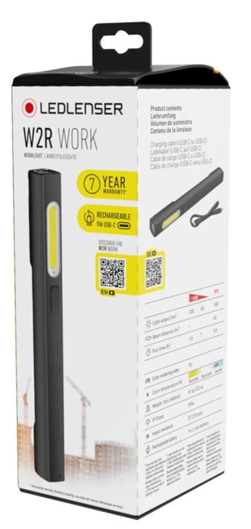 W2R Work je kompaktna, zmogljiva in izjemno natančna svetilka v obliki pisala (»pen light«). Odlično svetlobo svetilka zagotavlja prek reflektorja s katerim vidite vse detajle, ali pa preko LED luči za osvetlitev širokega območja. Svetilka ima tudi varnostno varovalo, ki preprečuje nenameren vklop in tako poskrbi, da se baterija ne izprzni. Svetilka ima obliko pisala in je opremljena z zaponko s pomočjo katere jo lahko brez problema namestite na prsni žep. Polnite jo enostavno s pomočjo priloženega USB-C kabla.