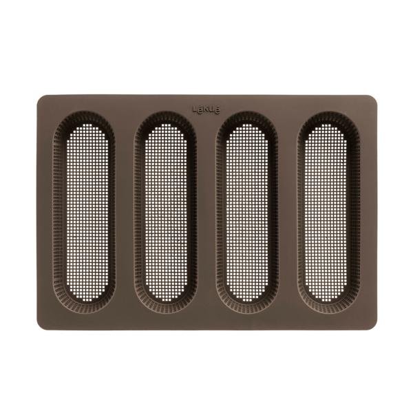 SILIKONSKI PEKAČ LEKUE za peko mini baguett, vam bo omogočil, da v udobju domače kuhinje spečete popolno žemljico za sendviče, zajtrk, kosilo ali večerjo. Podloga, prevlečena s premazom proti sprijemanju ima 4 kalupe oz. modele v velikosti 17 x 5 x 2 cm (150 ml). Mikro perforirano dno omogoča popolno kroženje toplega zraka med peko, pa tudi hitro ohlajanje, kar zagotavlja hrustljavo, skorjico. Prilagodljiv material - 100% platinasti silikon je varen za zdravje, odporen na visoke temperature in enostaven za čiščenje. Pomijte ga ročno z blagim detergentom.