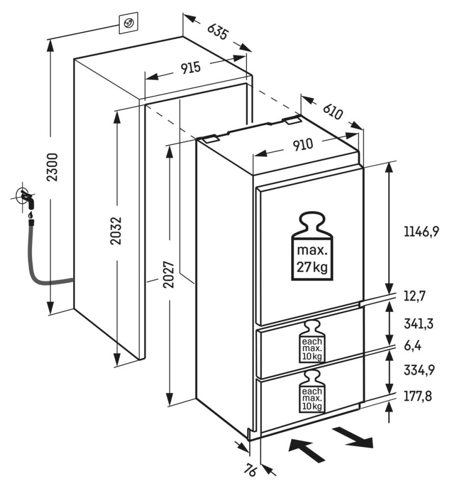 - Predal z izvlečnim sistemom v zamrzovalnem delu: Popolnoma raztegljive teleskopske tirnice s samozapiralnim mehanizmom