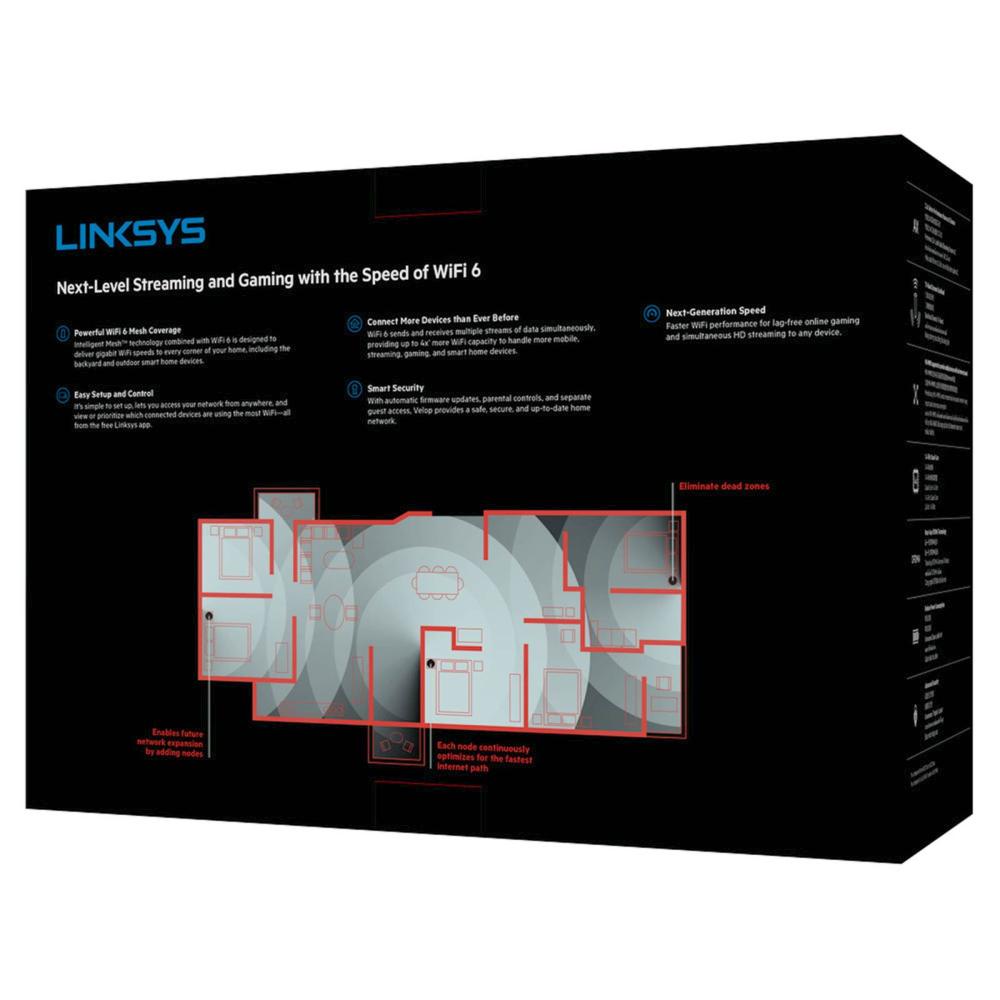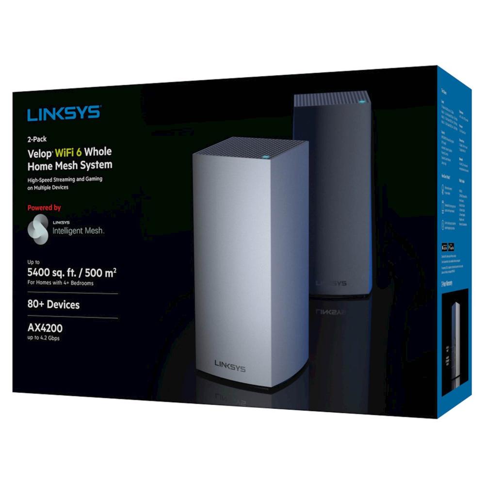 Sistem Linksys Velop Whole Home Intelligent Mesh WiFi 6 (AX4200), tripasovni, 2-paket (MX8400) zagotavlja pretakanje in igranje iger na naslednji ravni v več kot 40 naprav v vašem omrežju. Z enostavno nastavitvijo, napredno varnostjo in starševskim nadzorom je MX8400 bistvena nadgradnja za vsak dom. WiFi 6 istočasno pošilja in sprejema več tokov podatkov, kar zagotavlja do 4x * več zmogljivosti WiFi za upravljanje več mobilnih, pretočnih, igralnih in pametnih domačih naprav. Zmogljiva pokritost omrežja WiFi 6 Mesh. Enostavna nastavitev in nadzor Hitrost naslednje generacije
