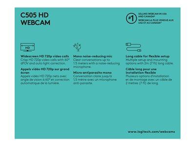 LOGITECH C505 HD je spletna kamera z HD 720p videom in mikrofonom velikega dosega, ki podpira jasen in naraven pogovor, oddaljen do 3 metre. Poleg tega pa omogoča izjemno dolg 2 m kabel USB-A izjemno vsestranske možnosti namestitve.