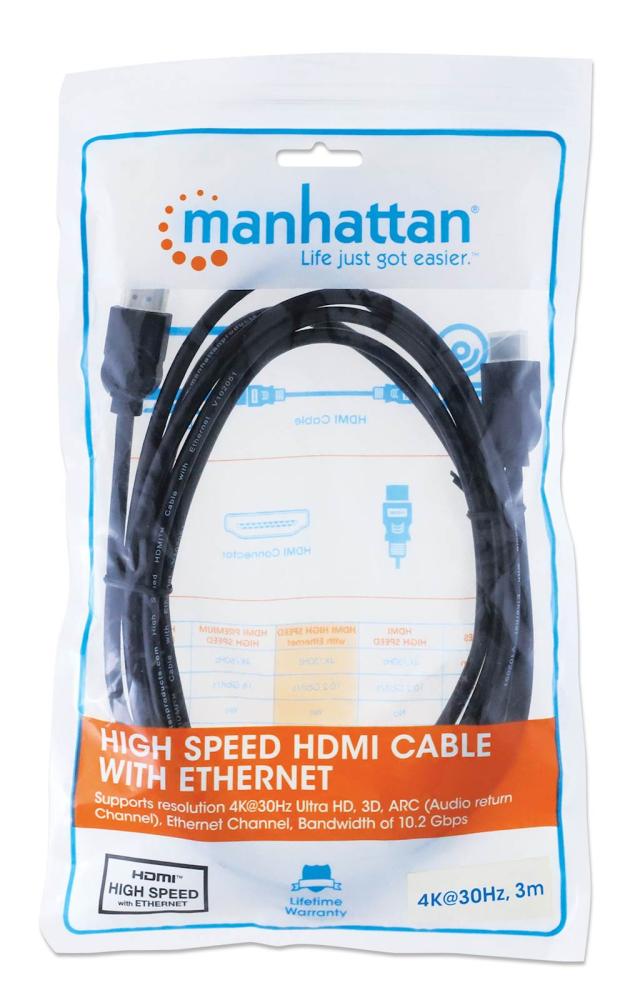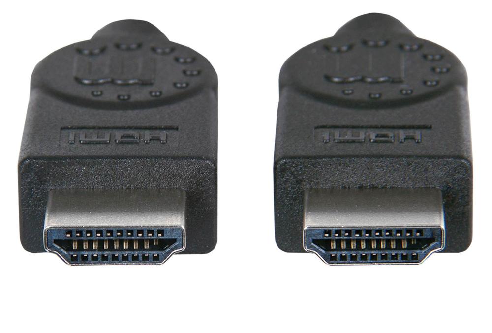 HDMI je postal standardna digitalna povezava, ki oddaja najkakovostnejši zvočni in video signal prek enega kabla. Kabli Manhattan za visoke hitrosti so zasnovani in skrbno izdelani tako, da zadovoljijo potrebe na trgu. Ta kabel zagotavlja najvišjo možno ločljivost pri 4K x 2K, zvočni povratni kanal in pasovno širino 10,2 Gbps pri 340 MHz.