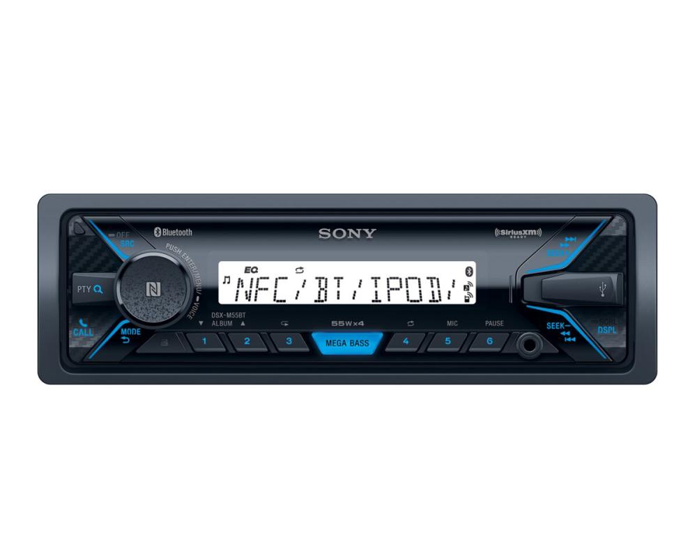 Z izjemno vsestranskim predstavnostnim sprejemnikom DSX-M55BT se lahko podate na vodne pustolovščine. Uživajte v bogatem in dinamičnem zvoku s funkcijo Mega Bass ter prek povezav USB, Bluetooth® in NFC z enim dotikom poslušajte vsebine vseh najljubših naprav. Siri® Eyes Free in vgrajeni mikrofon omogočata enostavno komunikacijo.Enostavna povezava Bluetooth z NFC z enim dotikom / Bluetooth za brezžično pretakanje zvoka