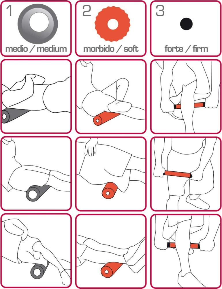 Komplet 3 masažnih valjev v enem. Notranji najbolj tanek valjček primemo z obema rokama ter masiramo želeno mesto. Ostala dva uporabimo s celo težo telesa. Z njimi masiramo mišico da jo raztegnemo, sprostimo ter prekrvavimo.