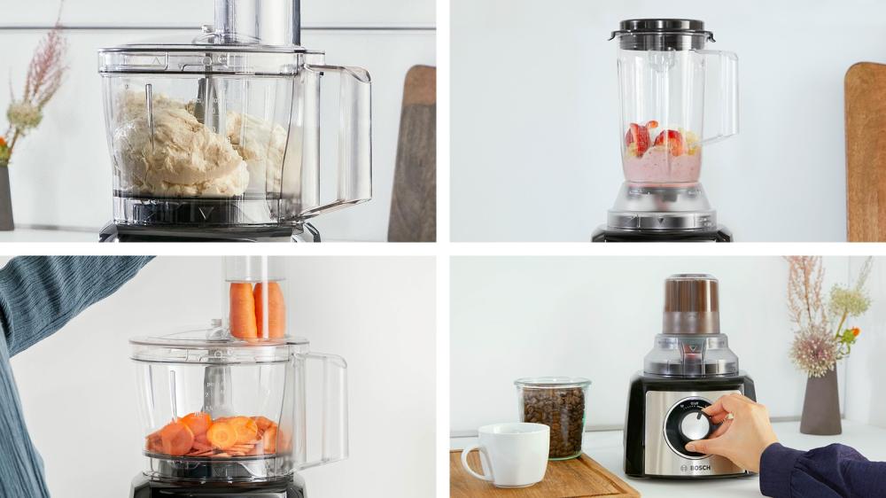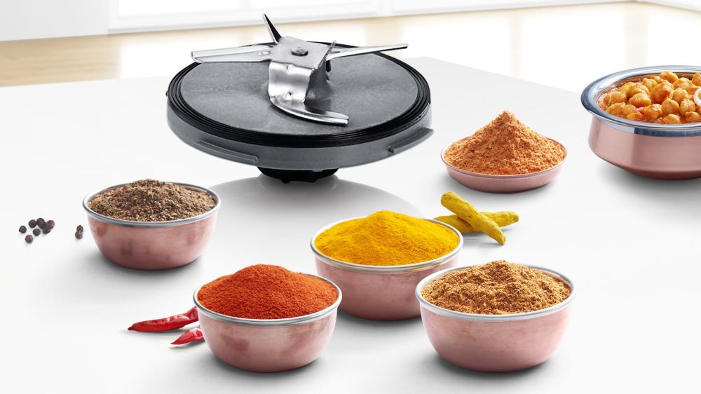 - Obdelava trdih sestavin kot so kavna zrna, trdi sir, začimbe ali ledene kocke - z nožem za mletje