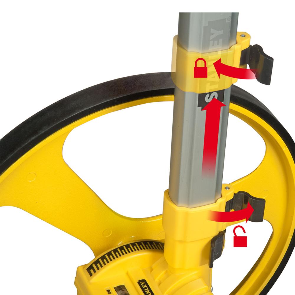 Stanley merilno kolo s števcem 10 000 m - Trpežen natančen števec - Števec s prestavnim pogonom s trdim plastičnim ohišjem za dolgo življensko dobo - 5 - številčni števec z ročnim reset gumbom za izvrstno natančnost - Heavy Duty zložljiv kovinski ročaj gumijasto ročno držalo za maks. obstojnost - Zložljivo ogrodje kolesa - Lita aluminijeva kolesa z odpornim gumijastim obodom za izboljšan oprijem in daljšo življensko dobo - Zložljivo Kick stojalo
