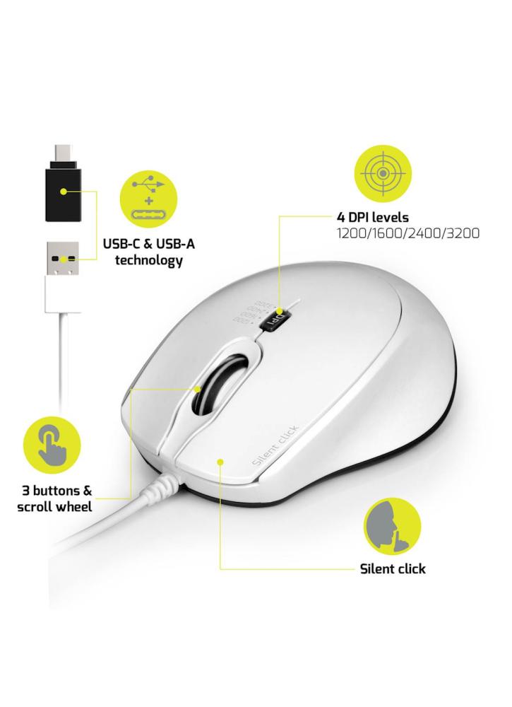 Miška je namenjena delu v pisarni. Ima možnost USB-A ali USB-C priklopa. Štiri nastavljive ravni hitrosti zagotavljajo optimalno natančnost, njen tihi klik pa pomaga ustvariti bolj mirno delovno okolje. Oblika je zasnovana tako, da zagotavlja optimalno udobje med uporabo. Dolžina kabla je 1,6 m kar omogoča veliko svobodo gibanja.