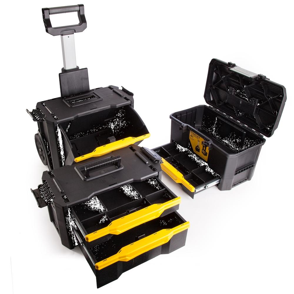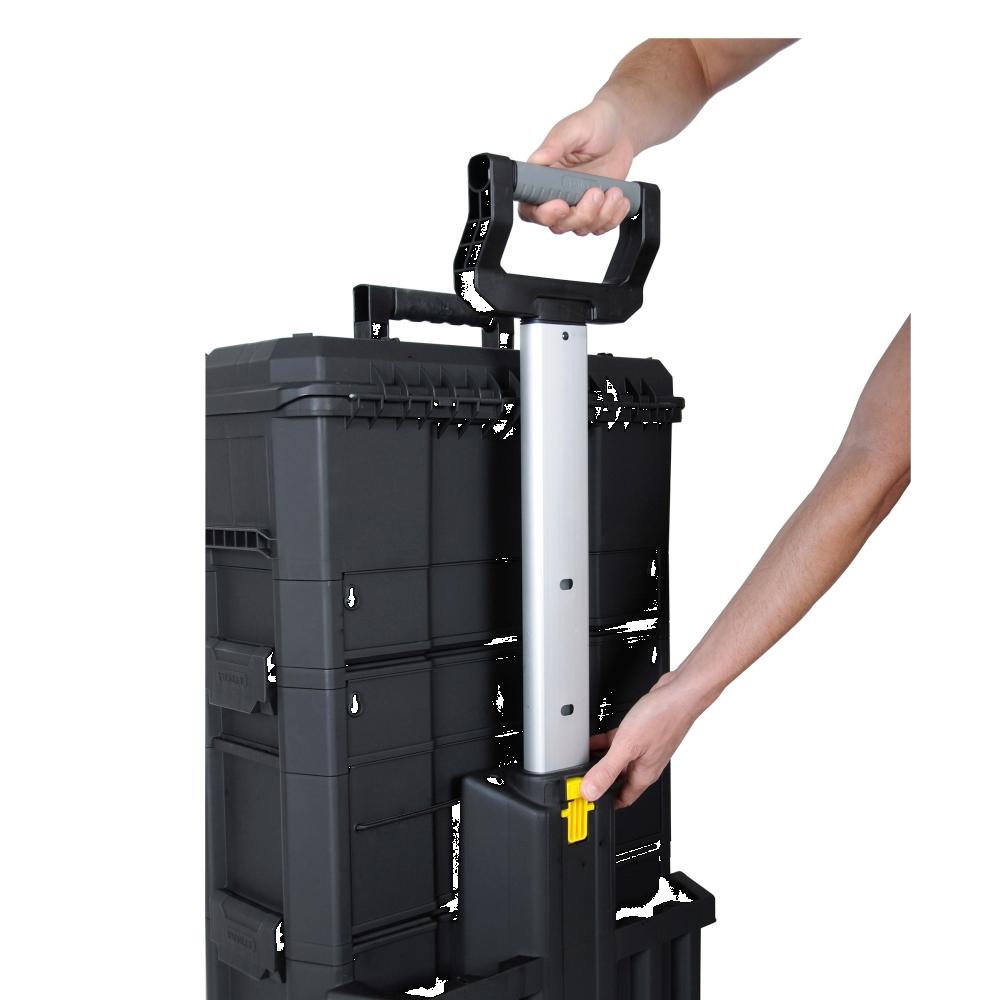 Stanley sestavljiva mobilna delovna postaja s kaseto in predalom - Prenosni in snemljivi zabojniki z ročaji na vrhnji strani omogočajo prilagoditev shranjevalnih možnosti in prenašanje le tistih razdelkov, ki jih potrebujete - Na vrhu snemljiva kaseta za orodje s predalom, ki ga lahko odprete enoročno - En plitek in en globok predal ter spodnji zaboj z žepom za shranjevanje dolgega orodja (žaga, libela) - Vsestranskaorganiziranost orodja vseh velikosti ter tudi manjših delov - Aluminijasti ročaj na zadnji strani za lažji dvig - ročaj je zložljiv - Robustna vodila z vgrajenimi krogličnimi ležaji za predale - Kakovostni drsni mehanizem z zaklepanjem - Robustna 7" kolesa za lažje prevažanje - Vrhnja 19" kaseta z enoročnim odpiranjem - Zapahi omogočajo, da odprete kasete oziroma zaboje enoročno