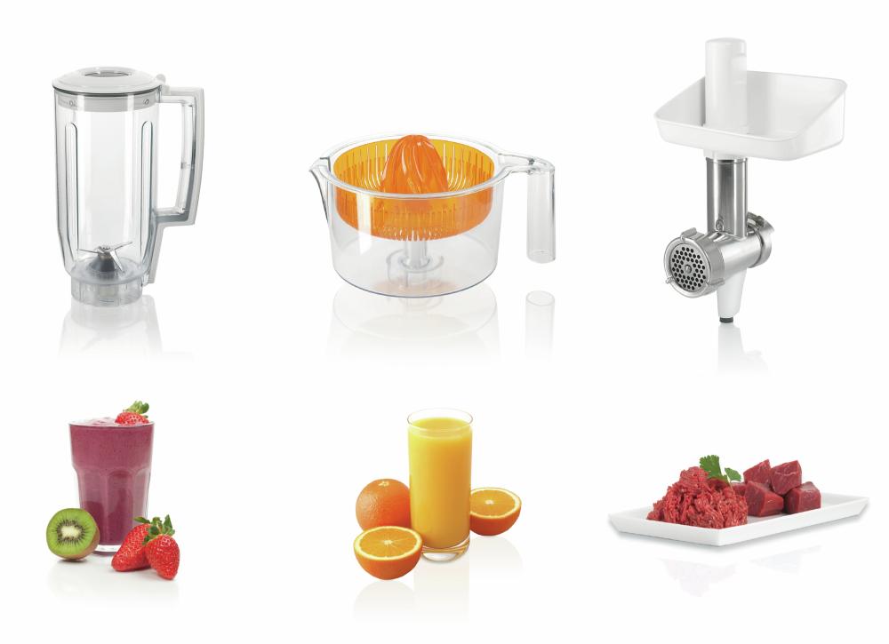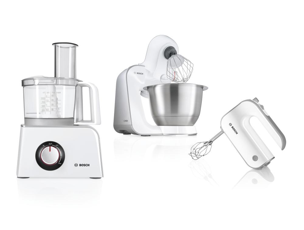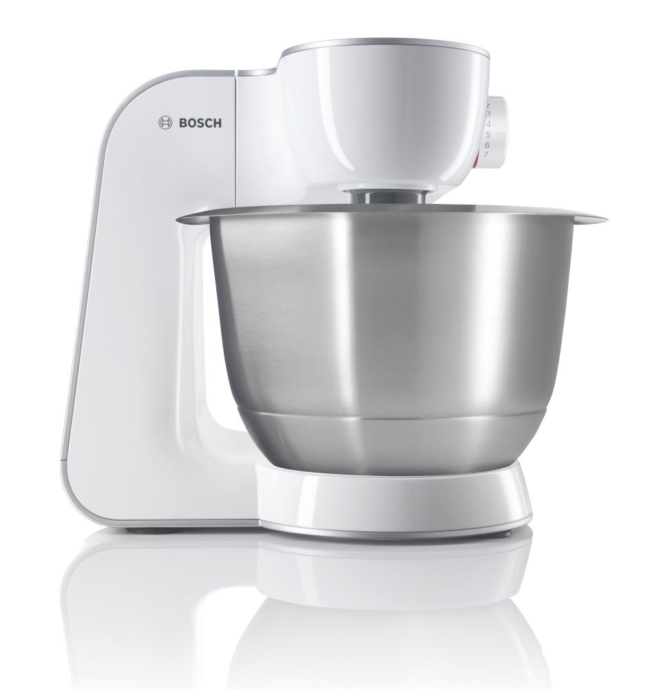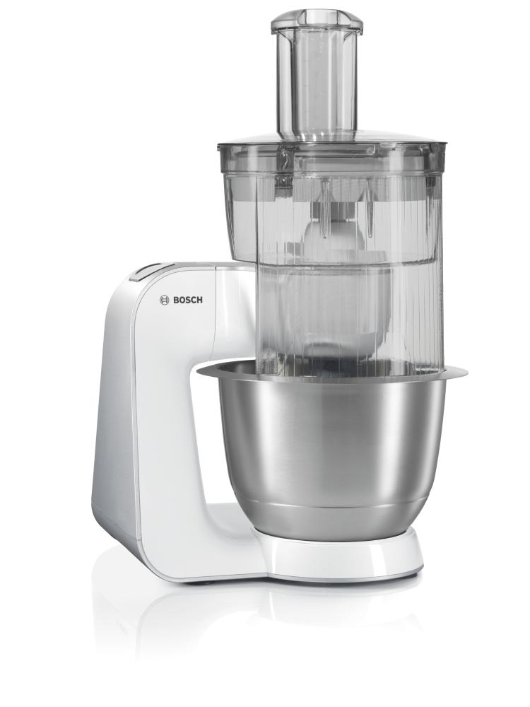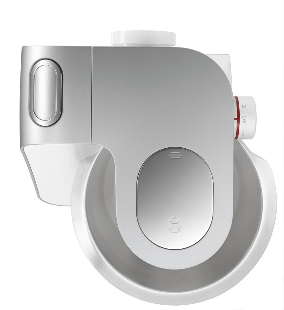 MUM5 — zmogljivi kuhinjski aparat, dobitnik nagrade za dizajn — odlikujejo ga splošna vsestranska in enostavna uporaba ter izjemna Boscheva kakovost. bela/srebrna