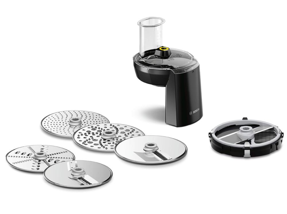- Pretočni sekljalnik z 5 ploščami iz nerjavečega jekla: obojestranska plošča za rezanje (tanka/debela), obojestranska plošča za strganje (groba/fina), plošča za grobo ribanje, plošča za fino ribanje in plošča za pripravo zelenjave na azijski način.