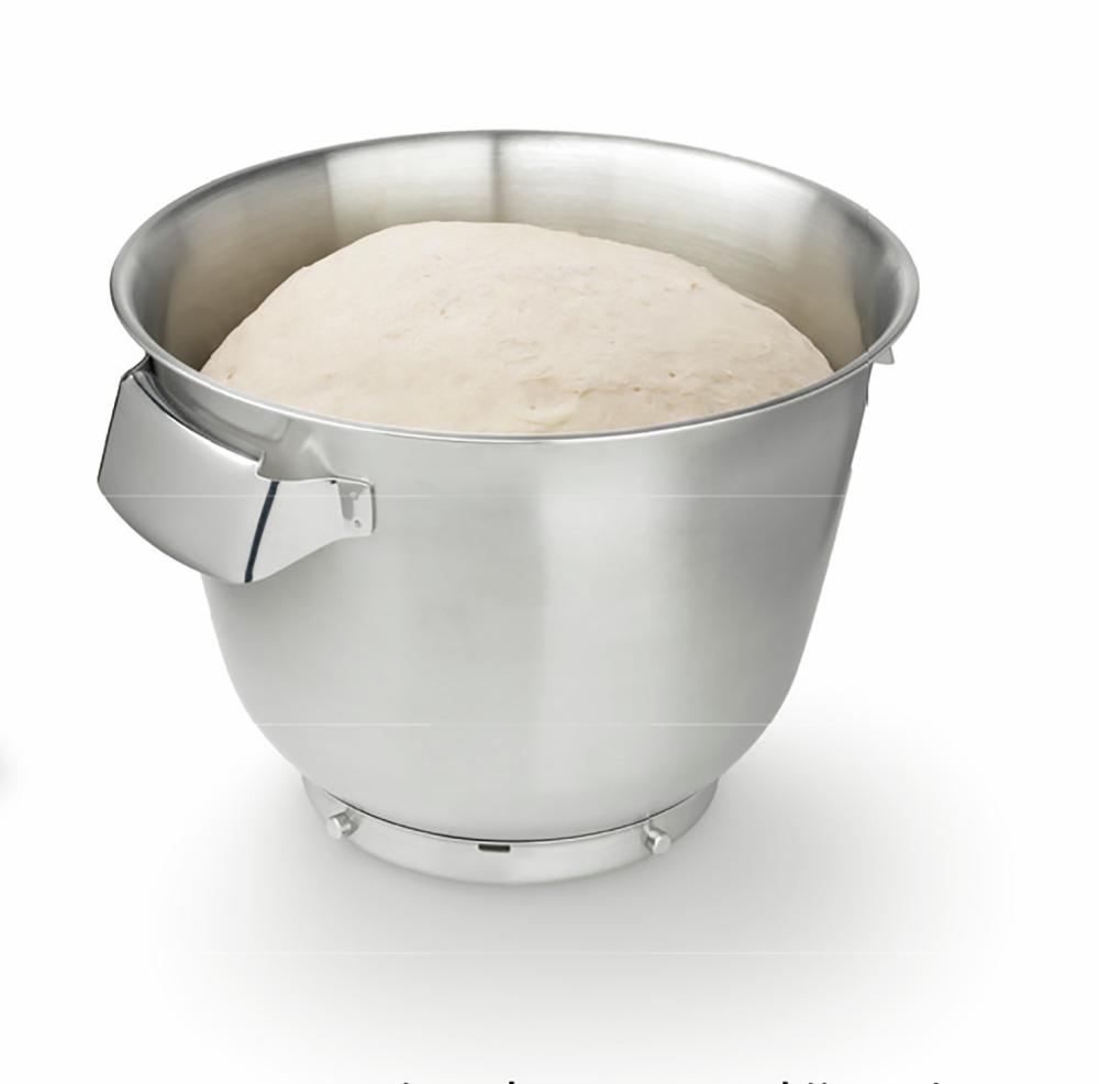 - Posebno velika mešalna posoda iz nerjavečega jekla s prostornino 5.5 l in dvema ročajema za enostavno uporabo za do 3.5 kg biskvita ali 1.5 kg moke plus dodatki za kvašeno testo
