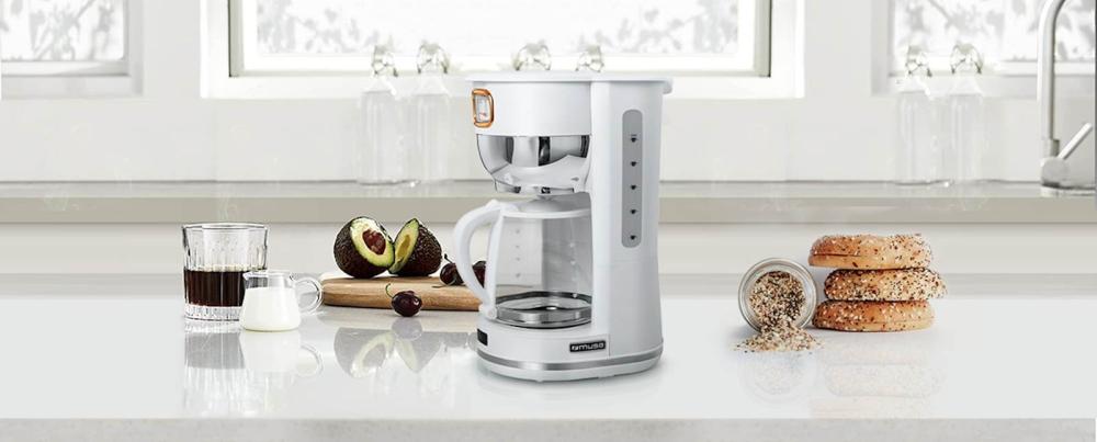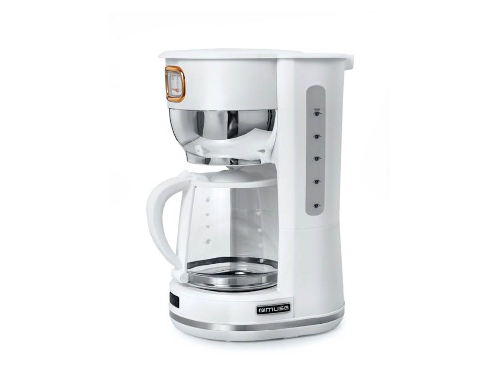 Aparat za kavo z indikatorjem nivoja vode. Ima funkcijo samodejnega izklopa, osvetljeno stikalo, snemljivo držalo, stekleni lonček za kavo. Prostornina rezervoarja za vodo je 1.4 L (10 skodelic). Moč 1000W
