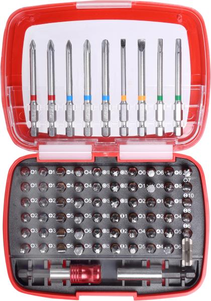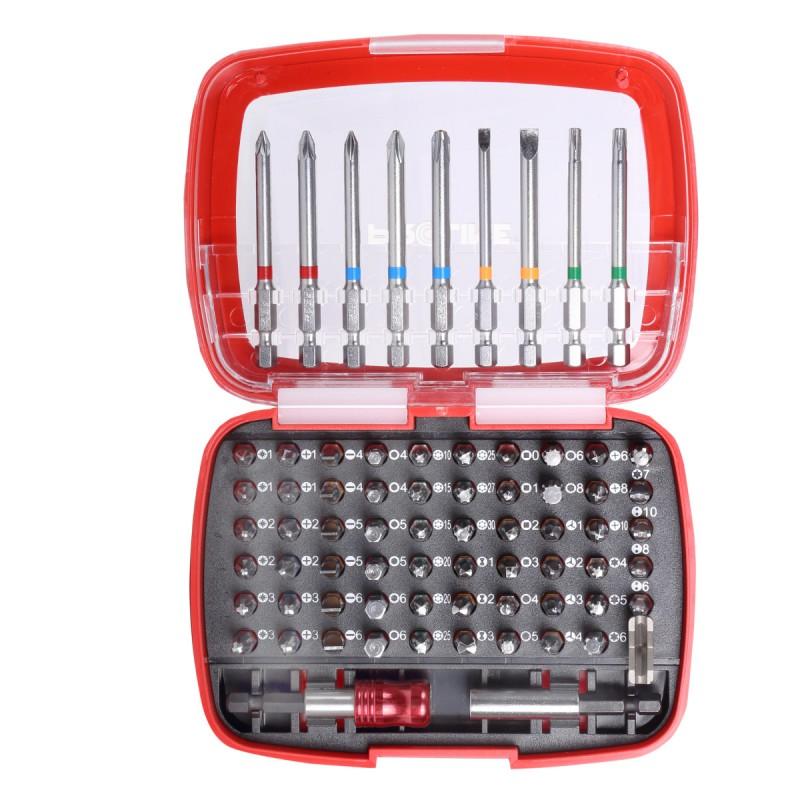 Komplet (nastavki): SL 4,5,6 / PH 1,2,3 / PZ 1,2,3 / Q 1,2,3 / H 4,5,6 / T 10,15,20,25,27 ,30 / KLJUČ 4,6,8,10 / TOPQ 6,8,10 / SKLOPKA 1,2,3 / RIBE 4,5,6,7 / SPLINE 4,5,6,8 / TRIWING 1,2,3 ,4 / adapter 1/4" 60mm, magnetni, hitri zapenjalec Izdelano iz visokokakovostnega jekla S2