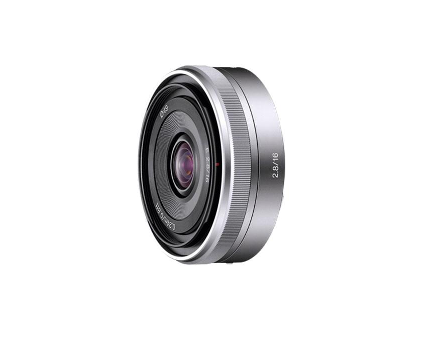 Širokokotni objektiv E 16 mm F2,8 - SEL16F28 tanke zasnove omogoča široko 16 mm pokritje in najširšo zaslonko do F2,8. Idealen objektiv za fotografiranje natrpanih notranjih prostorov ali veličastnih pokrajin.