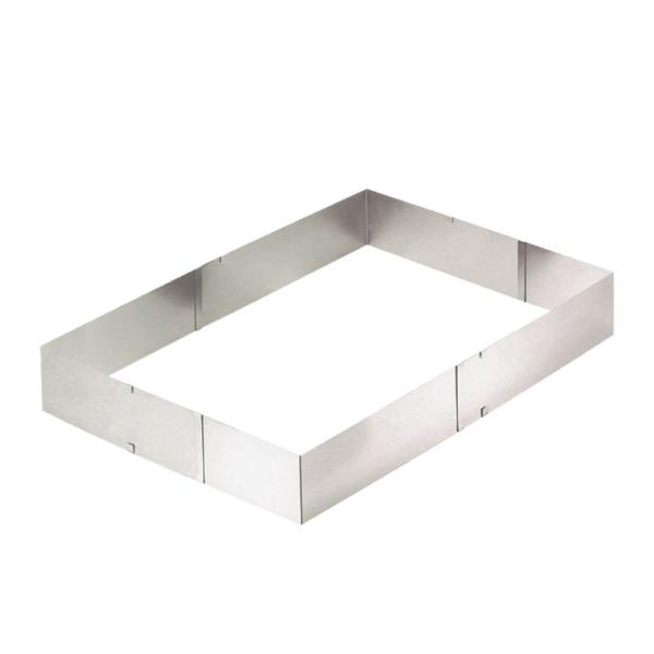 EVA NASTAVLJIV PRAVOKOTEN OKVIR (OBROČ) ZA TORTE, PECIVO iz nerjavečega jekla je visok 6 cm z možnostjo nastavljanja širine (od 16 – 25 cm) in dolžine (od 29 – 45 cm).