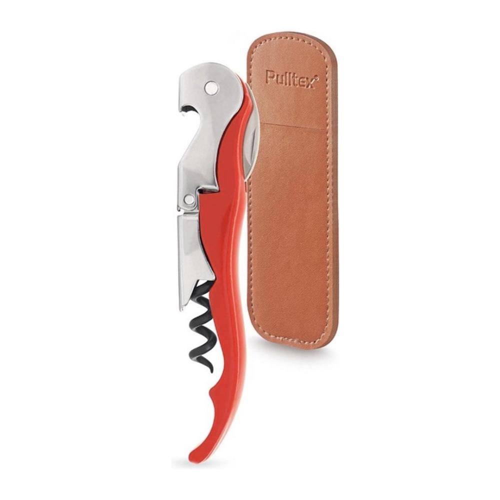 PULLTEX DVOSTOPENJSKI RDEČ ODPIRAČ ZA STEKLENICE je odličen pripomoček, ki ga z veseljem uporabljajo tudi profesionalci in restavracije. Dvojna ročica zamaška omogoča revolucionarno odpiranje steklenic v dveh korakih, brez poškodbe steklenice. Zraven je priložen rjav etui.