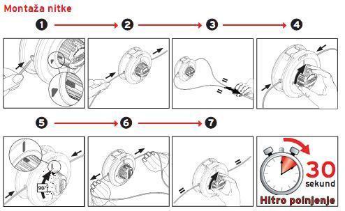 - pri menjavi vstavite novo najlonsko nitko z zunanje strani v tuljavo skozi odprtino v ohišju, notranja tuljava samodejno pritrdi nitko