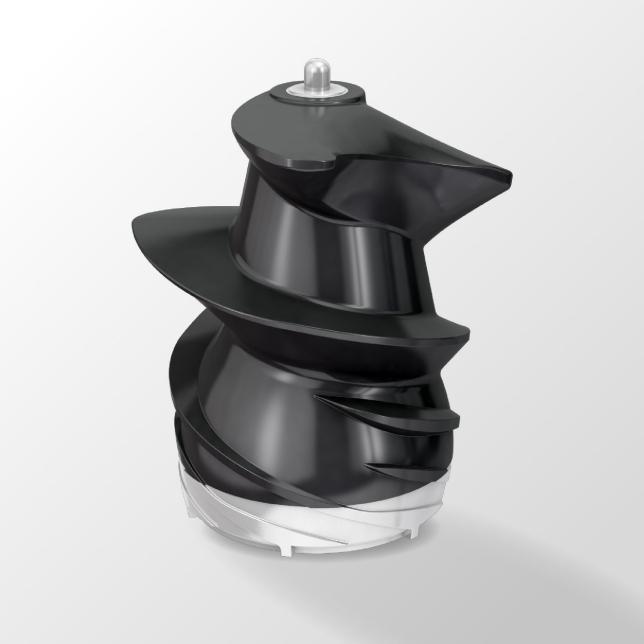 Zgornji del vijaka je podolgovat za učinkovitejše drobljenje. Sestavine se takoj zdrobijo in nato potisnejo navzdol za učinkovito stiskanje. Rezultat je močno drobljenje in stiskanje celo velikih trdih sestavin, kot je korenje.