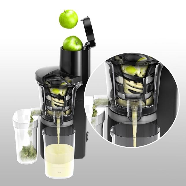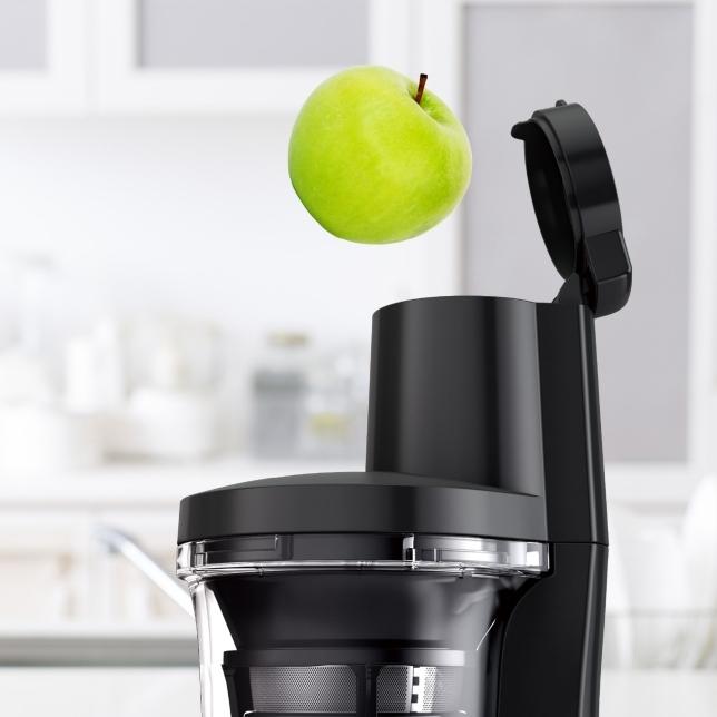 Prihranite čas, ne da bi morali najprej sekati sadje. Odprtina je široka 75 mm, zato lahko preprosto vržete cela jabolka, hruške, kivi itd. Sadje in zelenjava, vstavljeni v celoti, zagotavljajo več okusa in hranijo hranila med ekstrakcijo, zahvaljujoč počasnemu stiskanju.