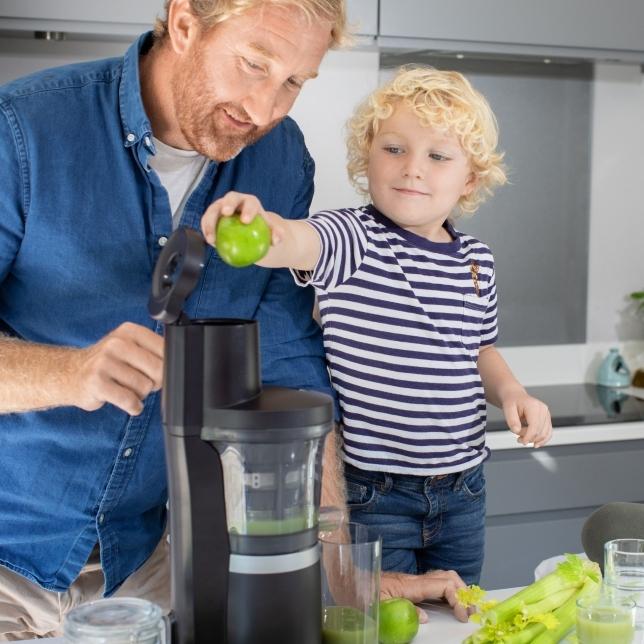 Otroci lahko uživajo tudi v učenju o zdravi prehrani s sokovnikom MJ-L700 Slow. Ko je pokrov odprt, se izdelek samodejno izklopi za popolno varnost. Za še hitrejše uživanje soka ima pokrov odprtino, tako da lahko med zagonom takoj dodate manjše sestavine, kot je korenje, s pokrovčkom zaprt.