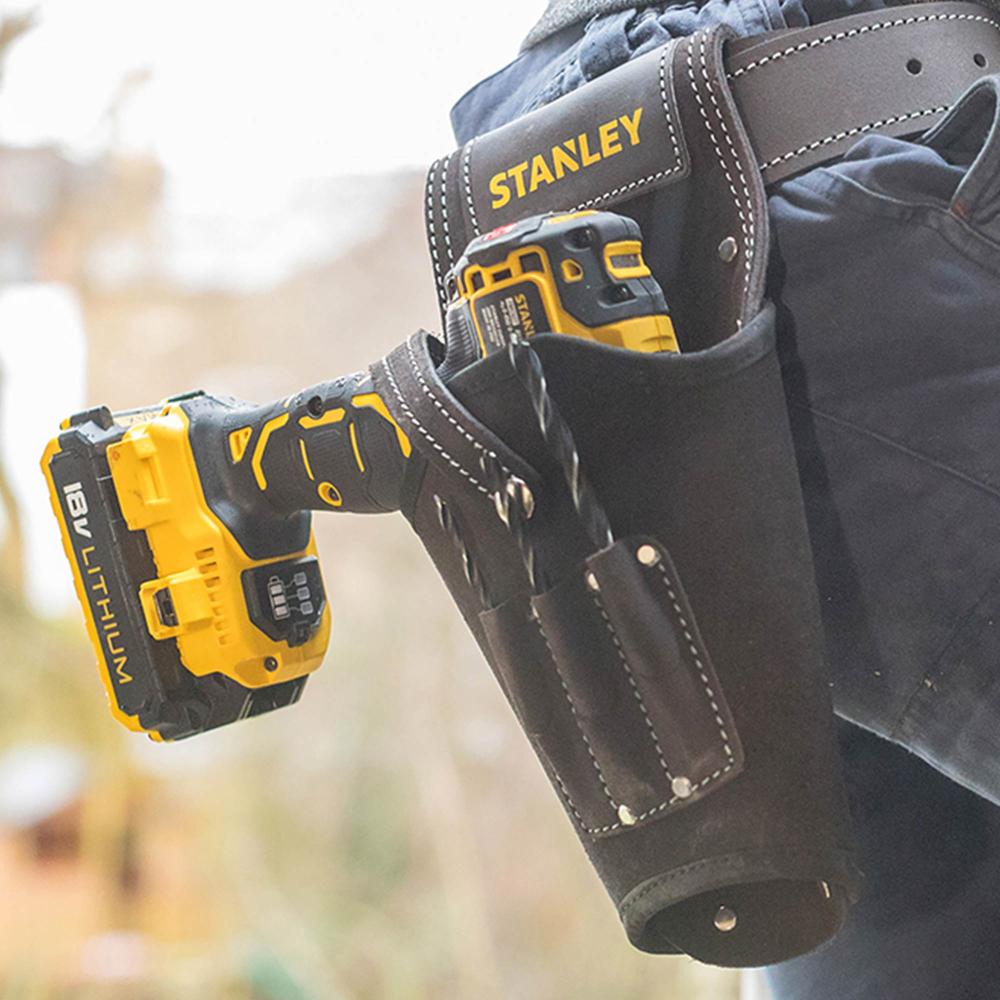 Stanley nosilec vrtalnika - Primeren za desničarje in levičarje - Usnjen pasek drži vrtalnik varno na mestu - Posebni žepki za organizacijo vijakov in svedrov - Primeren za uporabo z vsemi običajnimi pasovi
